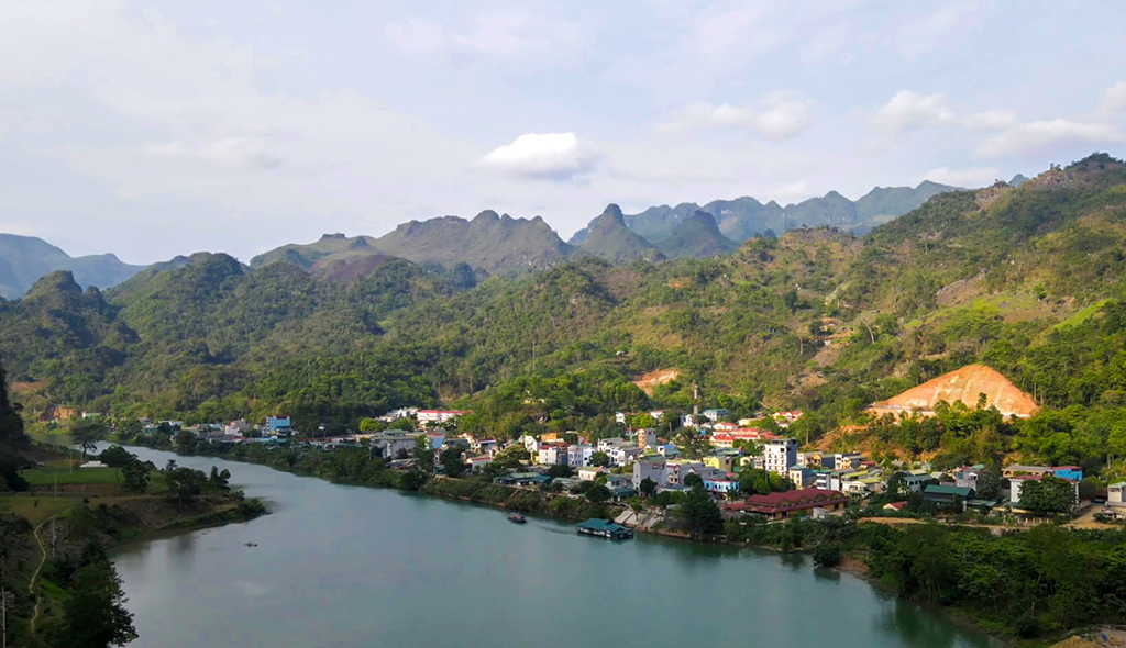 Đứng trên bờ sông Gâm, phóng tầm mắt ra xa, trời xanh, nước biếc hòa quyện thành bức tranh sơn thủy hiếm nơi nào có được. Xa xa là những bản làng người Mông, Dao nằm nép mình dưới chân núi, cảnh sắc trở nên kỳ vĩ hơn, để lại dấu ấn khó quên trong hành trình khám phá vùng biên cương.