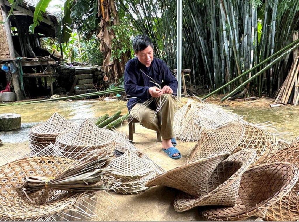 Nghệ nhân đang thực hiện các công đoạn đan nón Nùng
