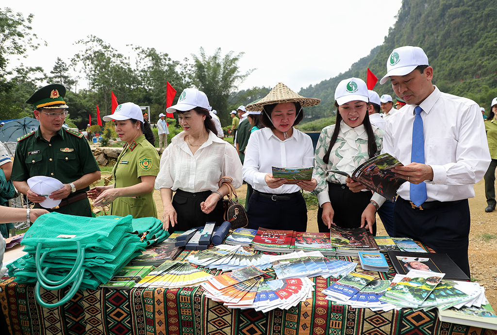 Các đại biểu, nhân dân và du khách tham quan khu trưng bày, giới thiệu các ấn phẩm tuyên truyền quảng bá du lịch tỉnh, Công viên địa chất Non nước Cao Bằng.
