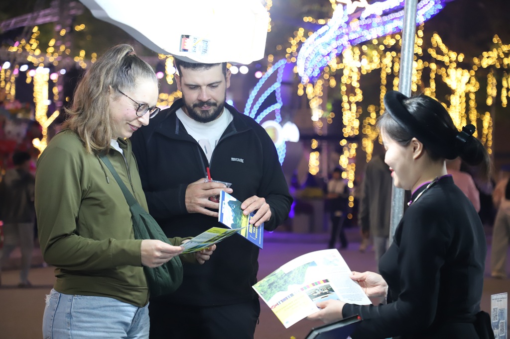 Du khách quốc tế tham quan, tìm hiểu các ấn phẩm quảng bá du lịch Cao Bằng